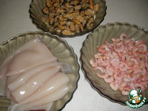 Подготавливаем морских жителей. Тушки кальмаров промываем, мидии и креветки размораживаем.