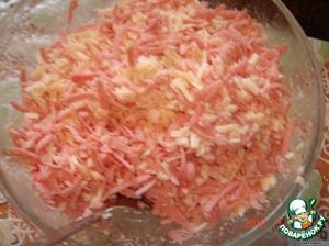 1. Колбасу, сыр, картофель натереть на крупной терке. Добавить лук (мелко резаный), яйцо, майонез. Все перемешать до однородной массы.