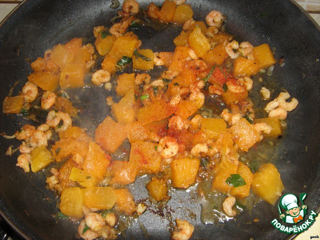 • На широкой сковороде обжариваем в оливковом масле порезанный чеснок, тыкву, порезанную кубиками, очищенные креветки. Добавляем вино и даем ему испариться. Солим, добавляем красный молотый перeц. Готовим пока тыква не станет мягкой (15-20 мин).