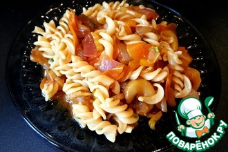 • Тем временем отвариваем почти до готовности спагетти, сцеживаем и отправляем на сковороду. Даем соусу впитаться. Подаем с белым сухим вином.