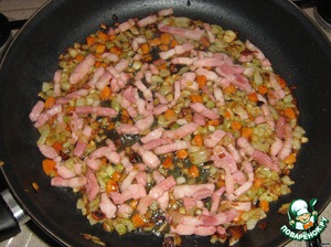 Между делом занимаемся приготовлением капусты...На вместительной сковороде обжариваем в оливковом масле лук, морковь, черешок сельдерея, порезанные кубиками. Добавляем веточки розмарина и листики шалфея (через 5 мин вынимаем их).