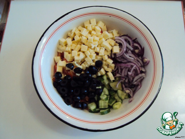 Сыр нарезать кубиками, маслины пополам (если крупные).
