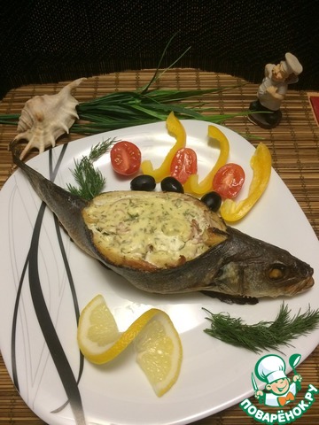 Положить начинку в сделанный в рыбе карман. Выложить сибас в огнеупорную форму, выстеленную пекарской бумагой и смазанную оливковым маслом.
