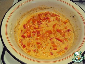 Болгарский перец и помидор порезать кубиками, выложить в соус, добавить кетчуп, довести до кипения. Отключить огонь. Оставить до полного остывания.