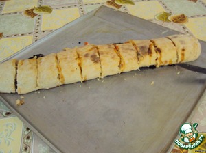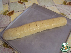 Свернуть в рулет, аккуратно переложить на смазанный противень, смазать верх растительным маслом. По всей длине, через 4-5 см сделать поперечные надрезы. Поставить рулет в разогретую духовку и выпекать 40-45 минут при температуре 180 градусов.