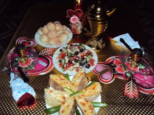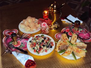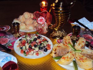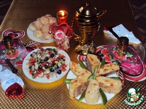 Стол я оформила в золотистом цвете, с красным акцентом. Муж был в полном восторге от моего подарка ("Цветочек" уплетался под рюмочку его любимого коньячка "Каравелла") сказав, что рыбный "цветок" сказoчно вкусен! Только вот в конце вечера смущённо спросил: "Любимая, это ведь правда было всё для меня...или больше для конкурса...?" Дорогие девочки, балуйте своих любимых почаще и не только в праздники...и на конкурсы...а то у них уже начнёт закрадываться сомнение...а действительно ли этот вечер именно для них...