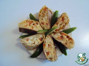 Кусочки рулета выложить на блюдо в виде цветка, украсить дольками огурца.