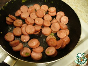 Сосиски порезать кружочками, обжарить с 2-х сторон до золотистого цвета.