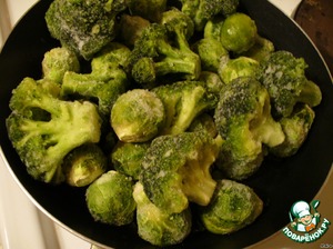 Брокколи и брюссельскую капусту обжаривать на сковороде минут 5 до полуготовности. Добавить «Вегетту».