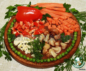 Морковь и сладкий перчик моем, очищаем и нарезаем кубиками. Грибы промываем и нарезаем четвертинками. Чеснок чистим и вместе с зеленью мелко нарезаем. Зеленый горошек и гречку по отдельности хорошо промываем.
