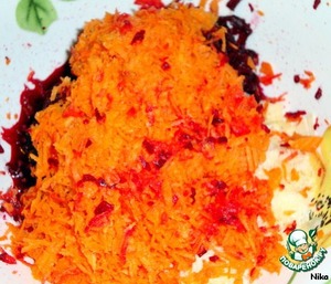 На крупной терке натереть свеклу, сыр, морковь.