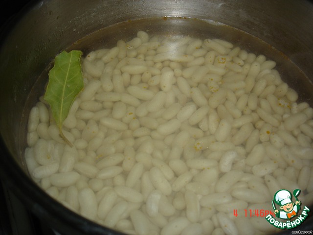Белую фасоль среднего размера замачиваем с вечера в холодной воде. На следующий день заливаем водой, варим 15 минут, сливаем воду, добавляем опять холодную и варим до готовности 1 час.