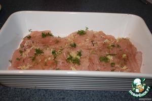 Пока лук маринуется, нарежем грудку ломтиками толщиной где-то до 1 см (против волокон, разумеется) и отобьем очень тонко, "до прозрачности". Еще одна хитрость: "Милый, а у тебя отбивной молоток есть?" - " Чего? Вот у меня - обычный...". Берем обычный молоток и стучим им по сковородке, которую (заранее отдраив или обернув пленкой) кладём на курочку. Делим биточки на 2-3 кучки. Первая кучка отправляется первым слоем в огнеупорную "микроволнующуюся" посудину. Разложить в один слой, натереть частью чесночка, посыпать солью, специями.