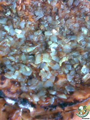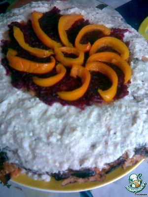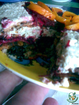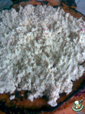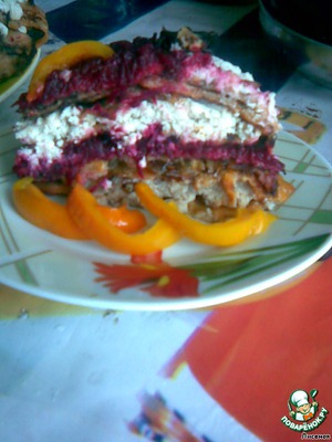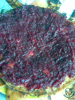 У меня оставалась куриная начинка. Я развела ее бульоном и обмазала пирог. Для контрастности еще середину намазала свеклой.