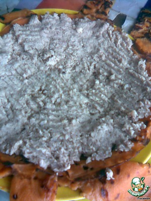 Полоски выложить на тарелку, в которой будете формировать пирог. Сверху полоски накрыть блином.