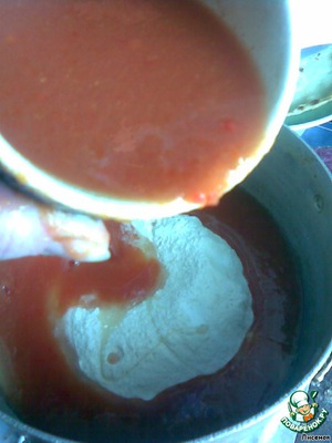 В муку вбиваем яйца, добавляем смешанный с водой томатный сок. Добавляем растительное масло и хорошенько взбиваем до однородности. Если масса покажется густой, то добавьте воды. Все будет зависеть от того, какой сок будет у Вас. У меня домашний, густой, поэтому я брала воды больше, чем 1,5 стакана.