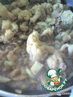Добавляем грибы и цветную капусту, пережариваем.