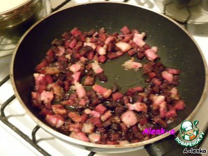 И оставила варить. В это время порезала копченую грудинку и салями, отправила это на жарку.