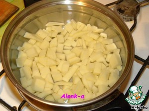 Картофель нарезали мелкими кусочками и отправили вариться.