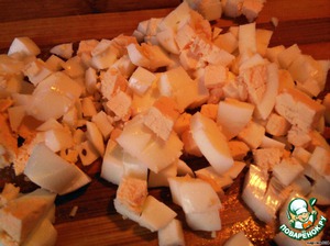 Яйца, предварительно отваренные, нарезать тоже кубиками
