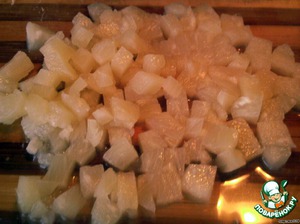 Ананасы нарезать кубиками или взять уже нарезанные кусочками