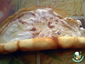 Затем берем первый блин смазываем его майонезом и скручиваем...