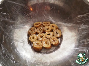 В результате у нас должна получиться формочка для салата из наших блинных рулетиков