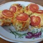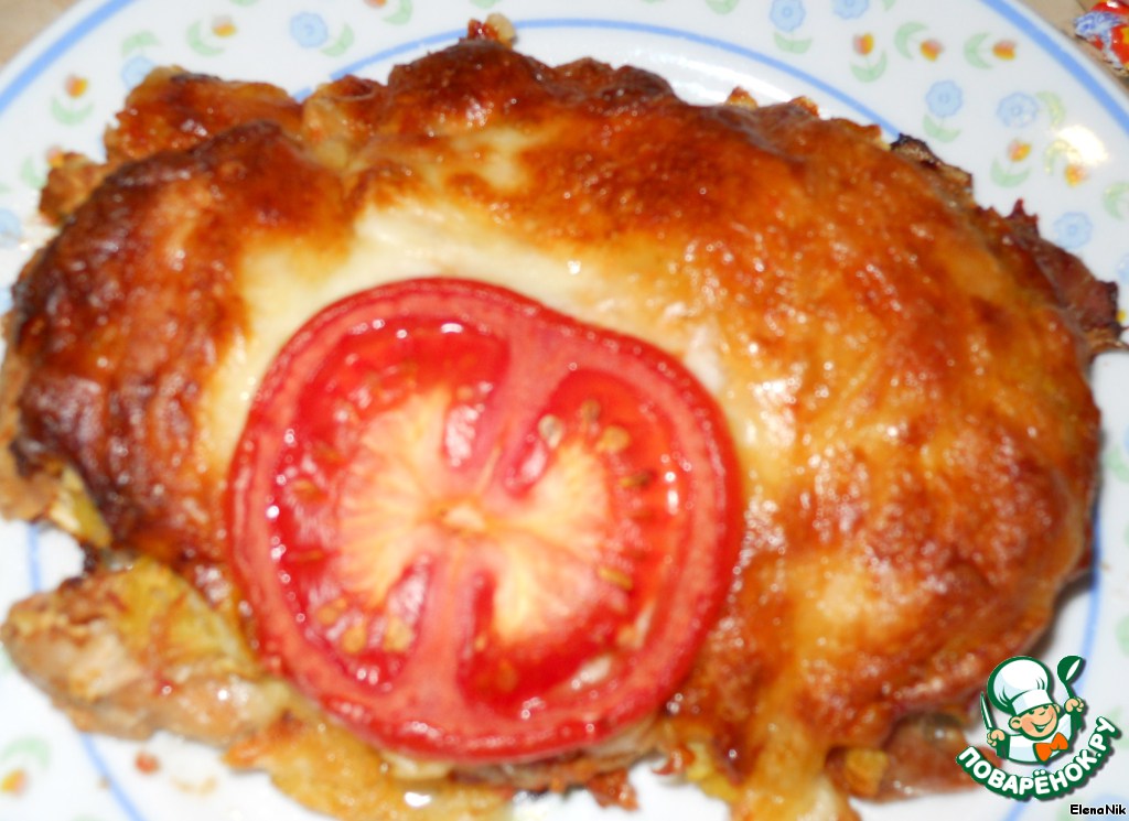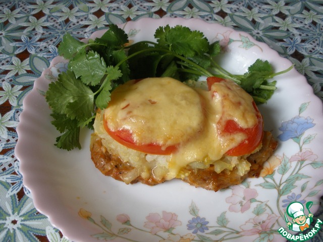 Свинину нарезать на порционные кусочки, отбить, посолить поперчить. Замариновать в соусе: майонез с кетчупом (оставить соус - он нам ещё пригодится) 4 часа. Лук порезать, картофель натереть, отдельно натереть сыр, помидоры порезать. Выкладываем на мяско лучок...