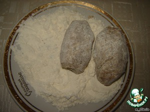 • В полученный фарш добавить крахмал и соль. Все тщательно перемешать. Сформировать из фарша котлеты и обвалять их в муке.