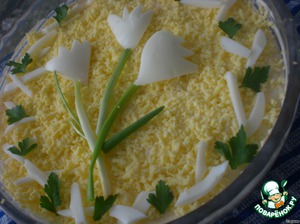 У нас сегодня так ласково светит солнышко, что прямо до невозможности захотелось прихода весны... Именно в таком настроении создавалось оформление салата. Сам рецепт нашла на форуме "Миллион меню", немножко его переработала и изменила. Никогда раньше не пробовала сочетать такие ингредиенты, но получилось неожиданно интересно и вкусно. Заходите, попробуйте.
