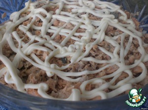 Теперь рыба. Этот слой смазываем половиной имеющегося у нас майонеза.