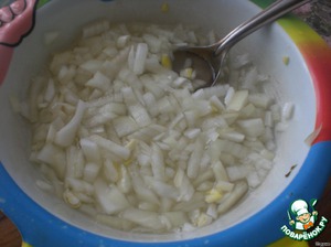 Лук почистим, порежем мелко и замаринуем в воде с уксусом и 0.5 ч. л сахара минут 20.