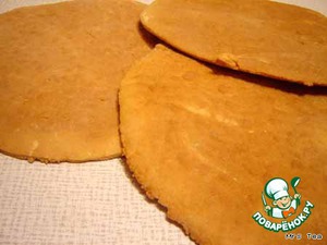 Испечь в прогретой духовке до золотистого цвета (не передерживать). Иногда коржи при выпечке могут немного приставать к противню, но легко снимаются широкой металлической лопаточкой. Горячие коржи друг на дружку не класть, они могут прилипнуть друг к другу. Остывшие коржи становятся чуть твердоватыми.