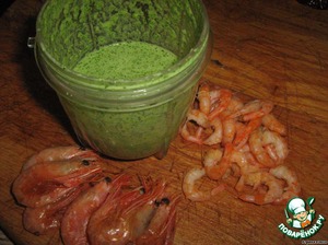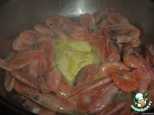 6. На разогретую сковородку кладём размороженные креветки, выпариваем их. Добавляем 50г. сливочного масла. Как только они начнут подрумяниваться, кладём измельчённый чеснок, жарим ещё 30 сек и выключаем.
