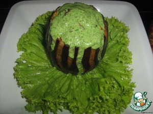11. В заранее подготовленные, тёплые тарелки выкладываем салат, сверху наши стаканчики. Поливаем соусом. На фото видно, как соус стекает по "дорожкам" стакана.