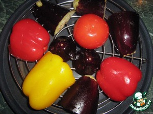 2. Перец, остатки баклажан и помидор смазываем оливковым маслом и в микроволновую печь, режим - гриль 20-30 минут.