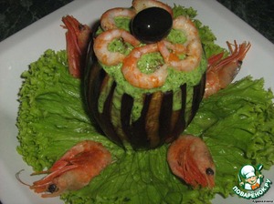 12. В завершение, выкладываем очищенные креветки в виде цветка на шапочке стакана и украшаем маслинкой. Неочищенные креветки раскладываем на салат.