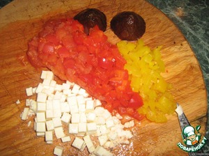 5. Подошедшие овощи - помидор и перец очищаем от кожицы. Режем в кубик. Остатки баклажана я убрала для другого блюда. Адыгейский сыр также измельчаем в кубик.