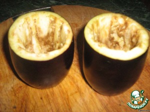 1. Вырезаем из баклажанов стаканчики. Вынимаем мякоть с мелкими косточками. Натираем чесночком и немного солим. Даём отстояться, чтобы вышла горечь.