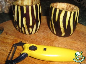 3. Смываем с баклажан горечь, вытираем салфетками. И теперь на ваш вкус можно натереть чесночком и солью внутри стакана. После я вырезаю фигурные дорожки на внешней стороне стакана и смазываю оливковым маслом.