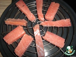 4. Сёмгу режем ломтиками, маринуем в соке лимона 5 минут. Смазываем оливковым маслом и опять микроволновую печь, режим- гриль на 30 минут.