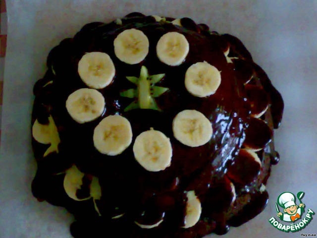 И всё это дело трёхэтажное полила сверху шоколадной глазурью. Делала её также по рецептуре Татарочки. Сверху украсила оставшимися кружочками бананов, и из кружочка киви вырезала что-то типа ёлочки.