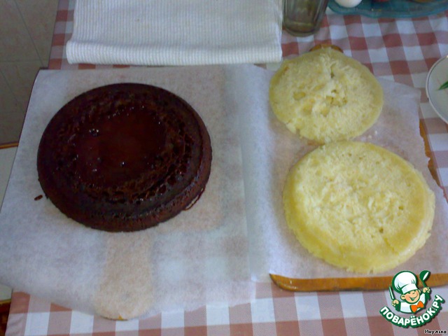 Потом, немного поразмыслив, я "усовершенствовала" его в 2 раза и на свой вкус. Взяв двойную порцию продуктов, испекла 2 коржа: белый и коричневый. Для аккуратности выкладывала коржи на пекарскую бумагу, чтобы не пачкался стол, когда поливаешь глазурью. -