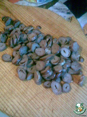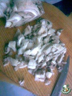 Грибы нарезать соломкой и потушить в масле сливочном. (У меня вешенки, можно шампиньоны.)