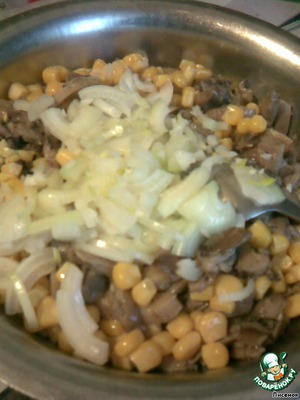 Соединить лук, грибы, сердечки и кукурузу. Заправить растительным маслом с уксусом. Добавить соль и перец по вкусу.
