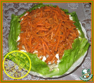 Этот салат я приготовила на "День влюбленных". Он не оставил равнодушным никого из гостей. А корейская морковка придала ему яркий цвет и вкус.