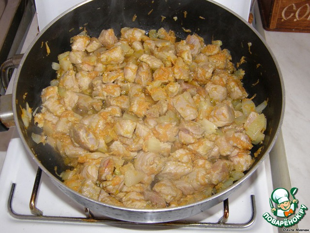 • Натертую на тёрке морковь смешиваем с нашинкованный луком, обжариваем затем добавляем мясо и всё обжариваем.