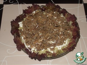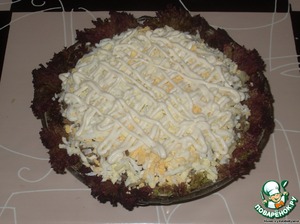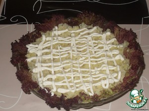 Блюдо выстелить листьями салата, натереть картошку на крупной терке, равномерно распределить ее. Сверху нанести сеточку из майонеза (положить майонез в небольшой полиэтиленовый пакет, отрезать маленький уголок и выдавить на салат в виде сеточки).