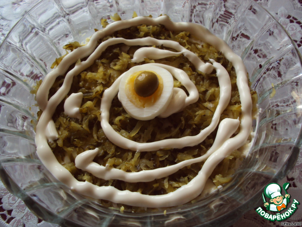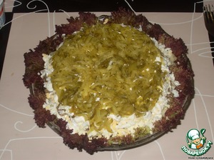 Огурчики натереть на крупной терке, слегка отжать. Выложить на яйца. Сверху смазать тонким слоем майонеза.