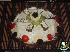 Сверху на салат выложить отложенные красивые рыбки, в центр поставить цветок из яйца (донышко немного срезать для устойчивости), по краю салата разложить кружочки яиц. У меня завалялся еще кусочек болгарского перца, вырезала из него кружочки. На яйца и в цветочек положить по половине чайной ложечки икры (но, если ее нет, то и не надо, можно обойтись и без нее).